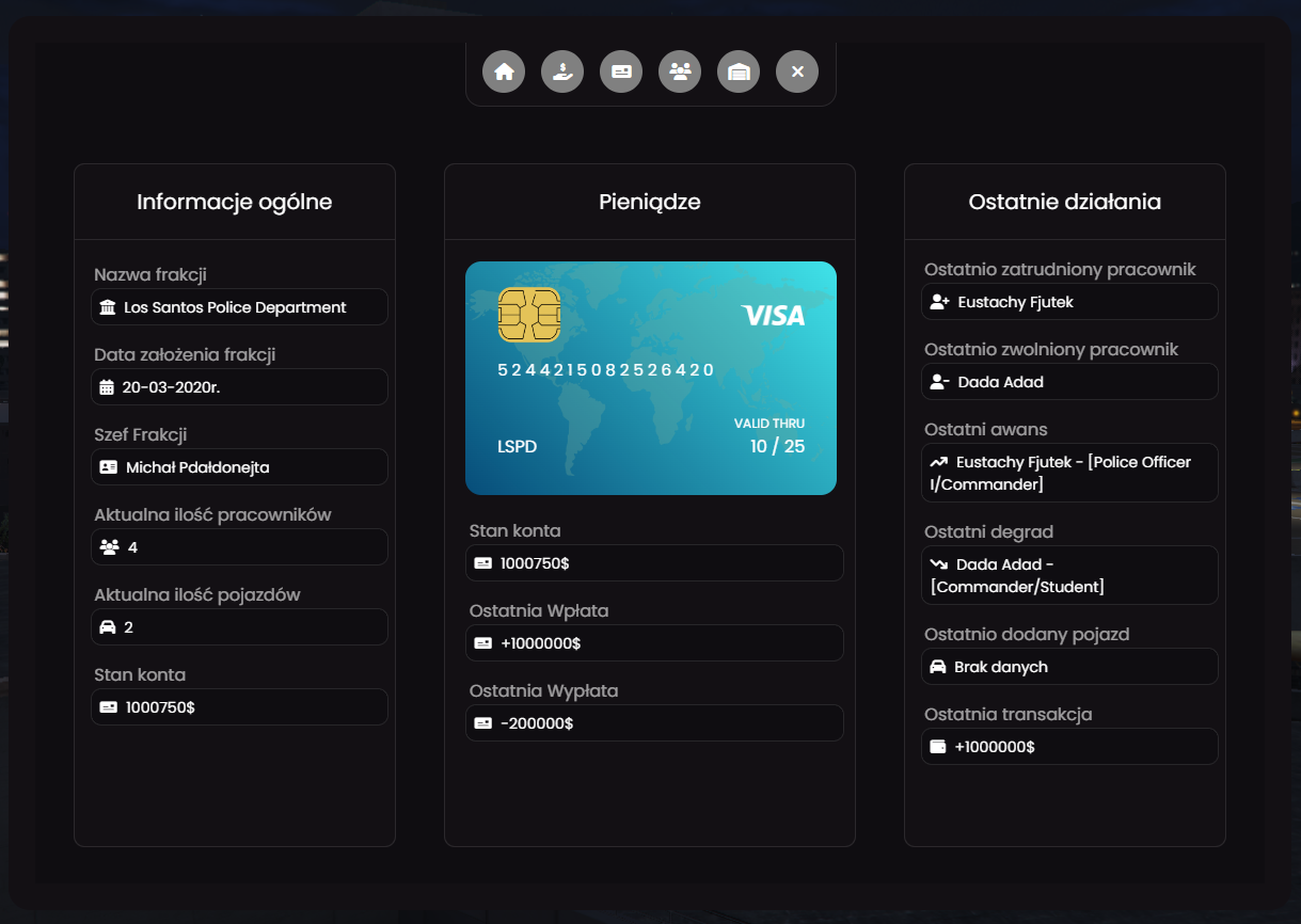 Wygląd tego bossmenu był remake'owany pod mój serwer, jest to full-script który posiada cały front-end oraz back-end. Jak widać na obrazku poniżej jest to bardzo rozbudowane bossmenu które posiada m.in zarządzanie garażem, pracownikami i wiele wiele więcej...