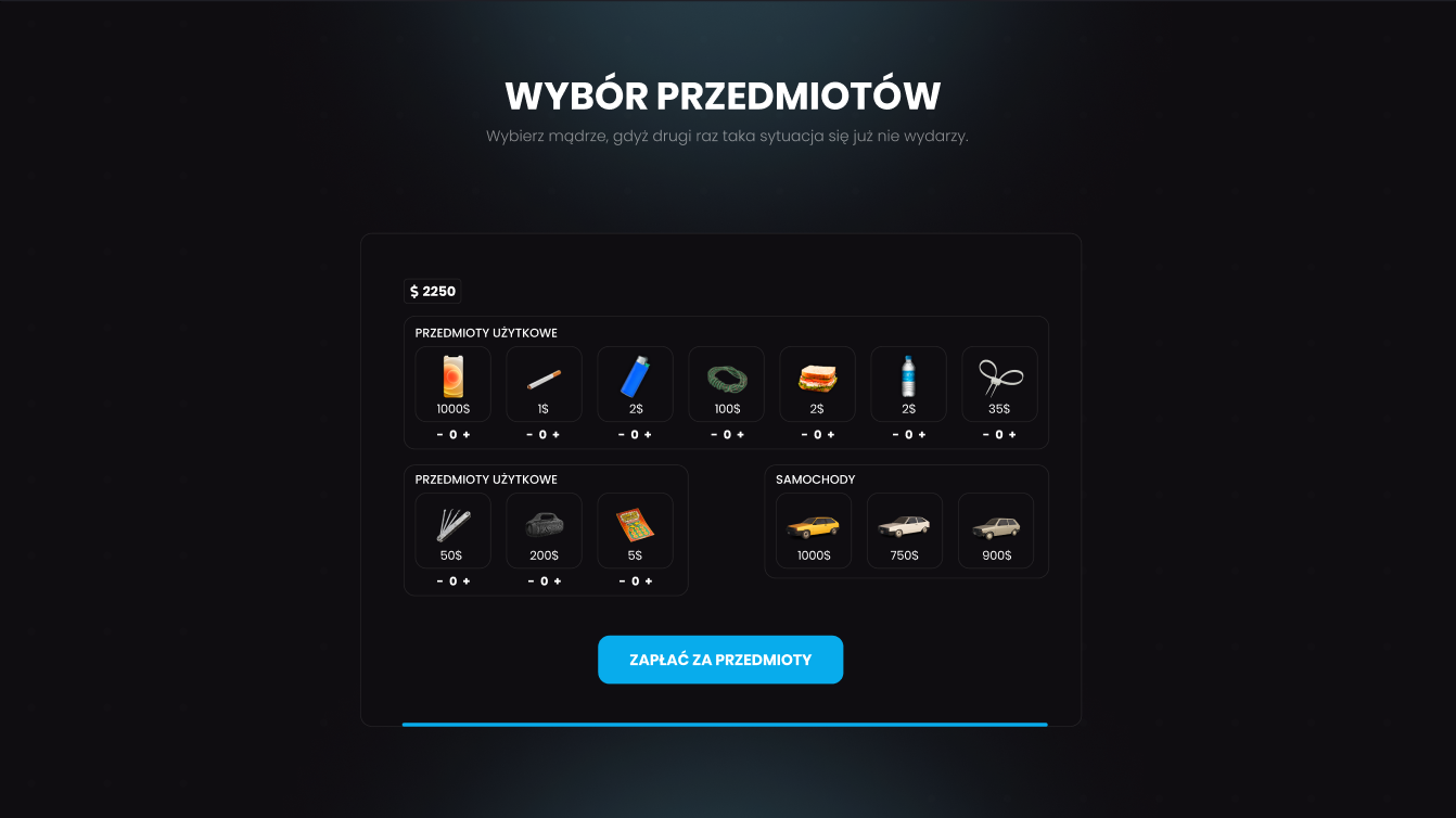 Wygląd tego hudu oraz sklepu startowego był projektowany przez klienta, jest to odwzorowanie 1:1 projektu z figmy klienta na kod. Skrypt ten jest w pełni skończony z własnoręcznie napisanym front-end'em oraz całym back-end'em.