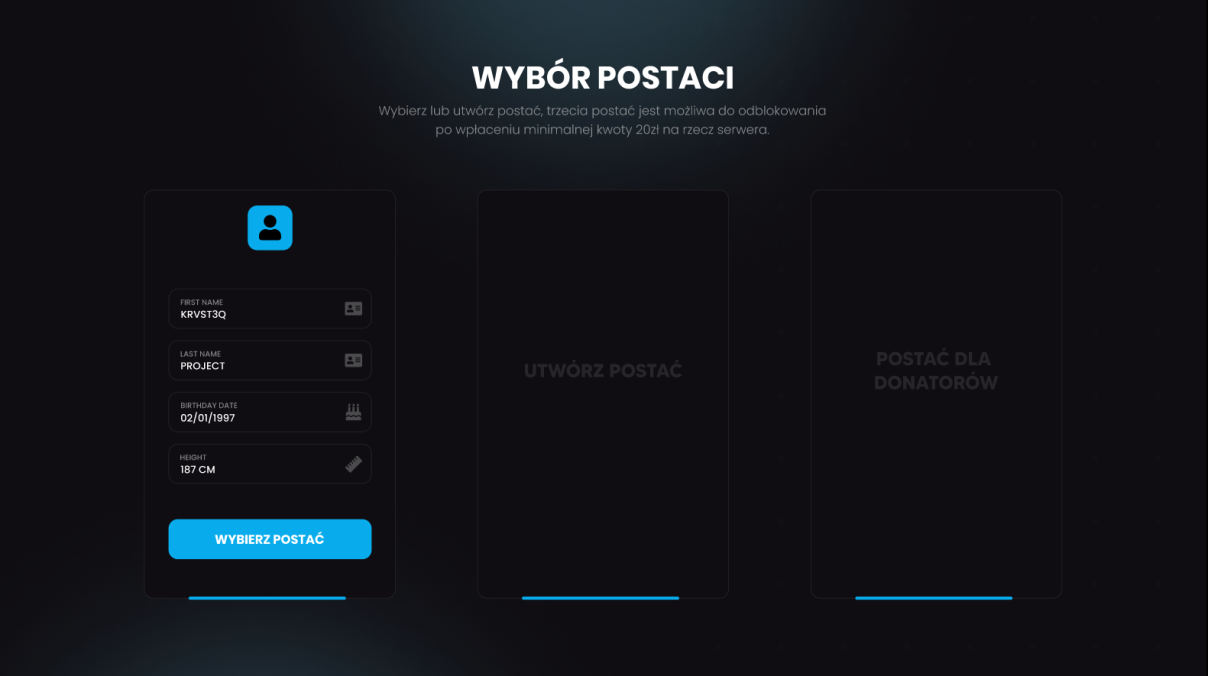 Wygląd tego systemu wyboru postaic był projektowany przez klienta, jest to odwzorowanie 1:1 projektu z figmy klienta na kod. Skrypt ten jest w pełni skończony z własnoręcznie napisanym front-end'em.